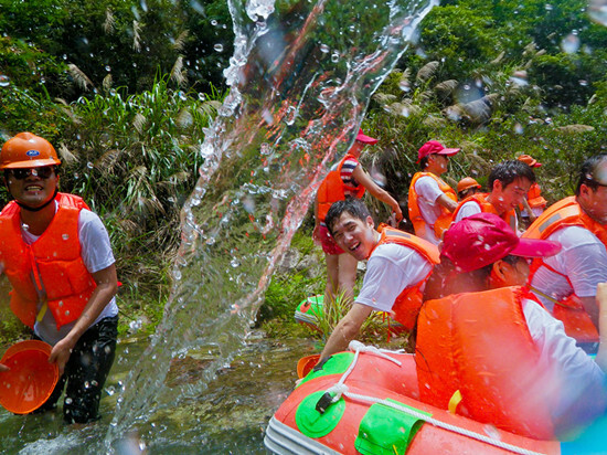 清涼水花飛濺引來女生們的聲聲尖叫,男生們則吼著嗓子大喊爽快。崎嶇的漂流水道驚險刺激,橡皮船橫沖直撞,險些卡在突起的石塊中間,很快就被后續(xù)飛沖下來的橡皮船撞開,猶如一場激烈的水上碰碰車大戰(zhàn)。每到一個水流平穩(wěn)的地方,部分男同事棄船蹲點,準備好滿滿的水,等待著被水流沖下來的同事展開密集的潑水攻勢,女生們力氣不敵男生最終敗下陣來舉白旗投降,有些男同事奮起對戰(zhàn)猛烈潑水,卻也因寡不敵眾輸?shù)脩K烈。