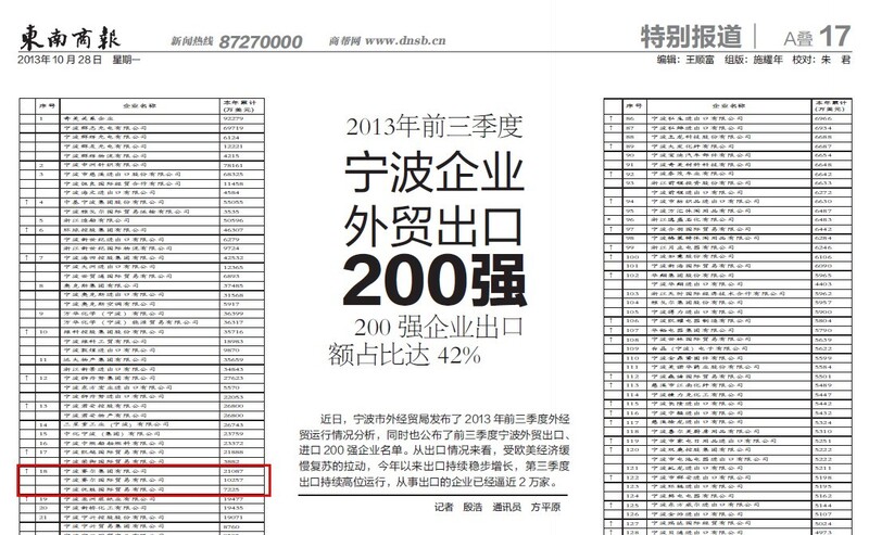 賽爾網訊 近日,寧波市外經貿局發布了2013年前三季度外經貿運行情況分析,并公布了前三季度寧波外貿出口、進出口200強企業榜單。我集團位列出口企業排行榜第18位,較去年同期相比,排名提升22位;位列進出口企業排行榜第42位,較去年同期相比,排名提升27位。