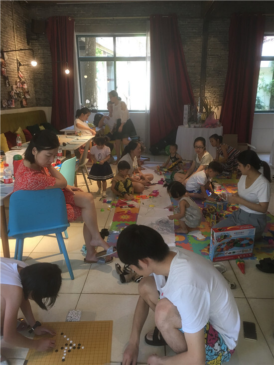 8月4日,天氣晴朗,優(yōu)景公司第一屆親子活動在大步里院拉開了序幕。共有13組家庭報名參加,其中3-5歲的寶貝居多。早上9點半,大家陸續(xù)來到大步里院,孩子們一看見我們?yōu)樗麄兙臏?zhǔn)備的畫板、水彩筆、印章等玩具,都迫不及待地脫掉鞋子,來到EVA墊子上,歡快地玩耍起來。