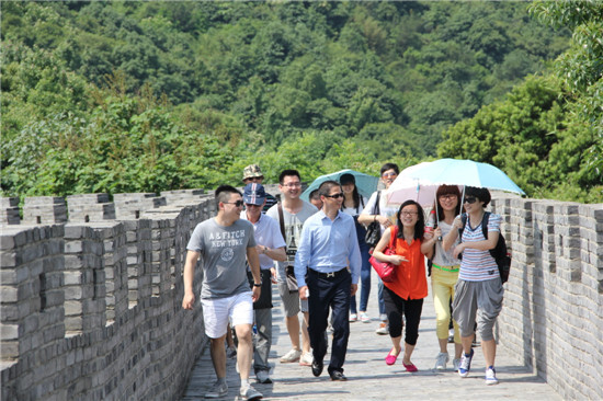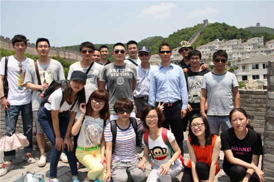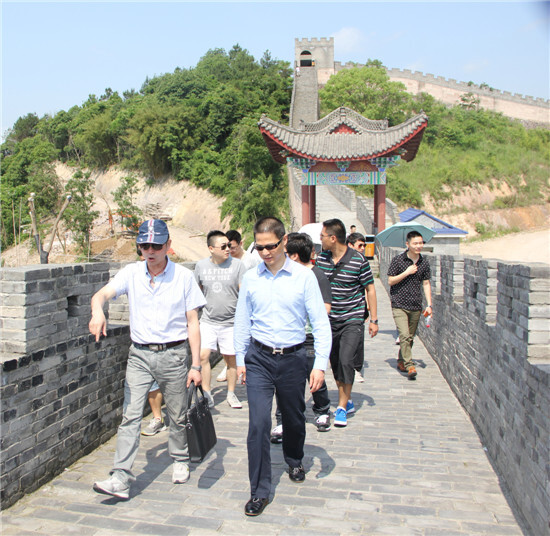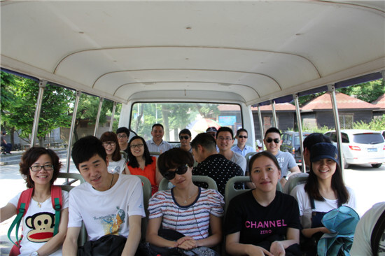 太陽鏡,遮陽傘,防曬霜,想必大伙都一樣不落了。525號,賽爾國貿(寧波運營中心)19人的大隊伍,在徐總的帶領下,來到了寧波奉化黃賢森林公園,開始挑戰氣勢雄偉的海上長城!整理隊伍準備出發,這第一個挑戰就來了。原來,從各位下車點到海上長城的起點,要經過一段陡峭的山坡。大伙考慮到今天的主要任務是“不到長城非好漢!”,所以就安排坐特制觀光bus上山!