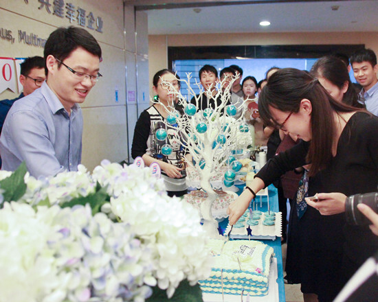 公司領(lǐng)導(dǎo)一起切蛋糕與大家分享,感動滿滿