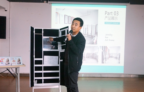 金華龍飛工藝品公司專業生產銷售珠寶柜、相框、鏡框等工藝產品。會上,總經理李文慧重點介紹了新產品多功能珠寶柜,外觀可以照鏡子,里面則可以掛首飾、毛巾、毛衣鏈等各種飾品配件,新穎獨特,設計性和實用性兼具,獲得在場業務人員的一致青睞。
