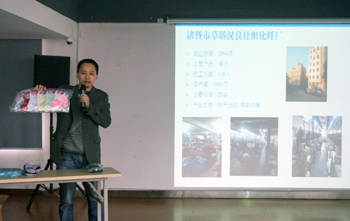 諸暨草塔鎮漢良針織化纖廠擁有各型襪機,主要從事各類襪子、毛褲、護腕、手機套等產品的生產、加工和出口,產品價格競爭力強,遠銷日本、美國、韓國等十余個國家。會上,總經理郭渭滬全方位介紹了企業情況和產品優勢,期待業務人員進一步洽談合作。