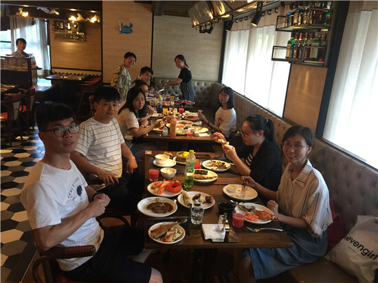 下午五點,大部隊前往夏威夷海鮮自助酒店,來一場適合發朋友圈的晚餐。我們為不能吃海鮮的莎莎計算要吃多少個哈根達斯才能回本,食物中毒的松哥只能看著我們大口吃肉然后默默喝粥,還發現了能吃幾盤海鮮+超大塊牛肉+N多水果的五部大胃王——周曉東同學。最后,秉著不能浪費食物的我們,開始了繞口令游戲,說錯的就要吃一筷子,不多會兒,桌上的菜就在灰化肥、紅鯉魚、八百標兵中全部消滅光了。