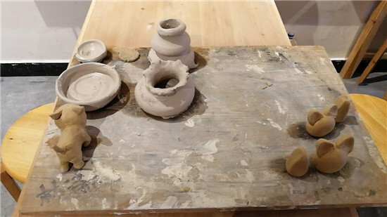 小伙伴們在一起玩玩泥巴,做做陶藝,何其自在……有些人選擇手捏一只貓,掛在門簾上做風鈴;有些人選擇拉胚,做一個煙灰缸送給老爸,或者做一個葫蘆形的花瓶,用來插花。雖然成果和設想相差甚遠,畢竟大家都是第一次認真玩泥巴,但是so what,自己做的東西,獨一無二就好!