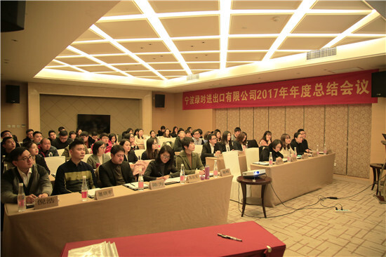 大會首先向全體員工展現了綠時在過去一年的成績單,繼而表彰了綠時進出口2017年度晉升員工及優秀員工。公司領導層分別為每位獲獎者頒發了獎杯、證書和獎金。晉升和獲優代表也給大家分享了他們的成功經驗。最后徐平炬總裁和謝峰總經理分別作會議總結。大家一起合影留念,并為賽爾獻上了新春祝福。