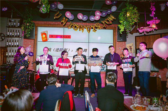 會議結束之后,大家陸續(xù)抵達龐客酒吧,酒過三巡,主持人錢青和周慧,步入舞臺中央,拉開了2017年優(yōu)景小年夜的帷幕。此次小年夜的主題是:奮斗路上,我們永遠十八!第一個節(jié)目是新人報道,2017年新進員工一一亮相作自我介紹,通過才藝展示和趣味游戲,讓大家對新同事有了更全面的了解。接下來的各色互動小游戲,讓臺下的同事笑得前仰后翻。