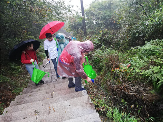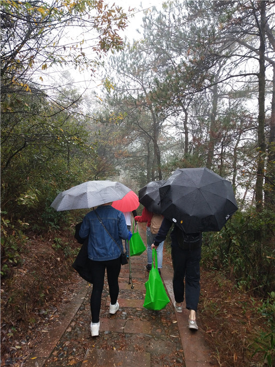 到達德勝巖山腳,新人們兩人一組自行組隊,領取了一些工具和物資后迅速出發。秋雨唰唰地下著,細密的雨絲在山路間織起了一張灰蒙蒙的幔帳。我們或披著雨衣或撐著雨傘,小心翼翼地走在德勝巖的山路上,雖然路途艱辛,但所有小伙伴依舊神采奕奕,一路上有說有笑。新同事們一人撿拾垃圾,一人撐著環保袋,配合相當默契。