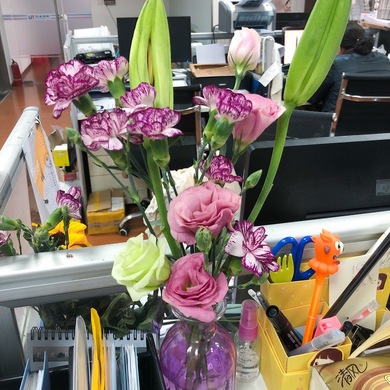 今年的女神節(jié),我們公司過得其實(shí)比往年要早。因?yàn)樵缭诠?jié)日前4天,我們的“后勤部長”毛鈺雪同志就已經(jīng)為全公司采購了真正的鮮花。從4天前的含苞待放到如今的花開正盛,辦公室已被鮮花包圍,看得人心情也美麗了起來。