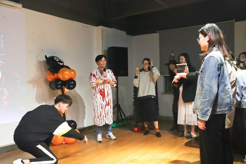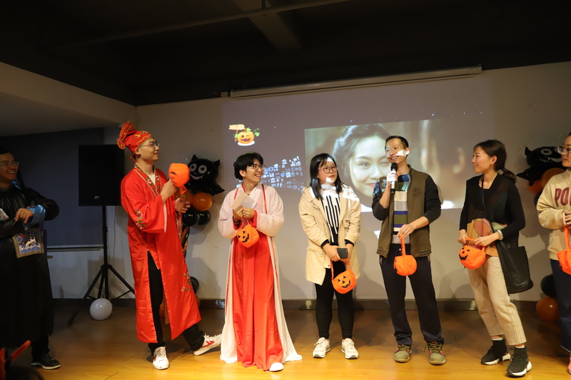萬圣節怎么可以少了trick or treat 的樂趣呢?一進門,身著女巫斗篷的工作人員就為每位入場的朋友分發了炫彩糖果。身著血淋淋醫生服和搞怪僵尸服的兩大男主持宣布活動開場。話音剛落,由舞蹈社社長陳雪君扮演的白衣女鬼帶領兩大門鬼及兩位男主持貢獻了詭異又搞笑的開場舞,瞬間活躍起了現場氣氛。