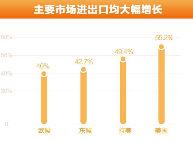 從主要市場來看,浙江對主要市場出口、進口均實現大幅增長,歐美對浙江出口拉動作用較大。對歐盟、美國、東盟、拉美出口分別增長40.0%、55.2%、42.7%、49.4%,分別拉動全省出口增長7.5、8.8、4.9、4.4個百分點。自東盟、拉美、美國分別進口438.4、270.8、160.2億元,增長32.3%、74.6%、1.4倍,拉動全省進口增長5.7、6.2、5.0個百分點。