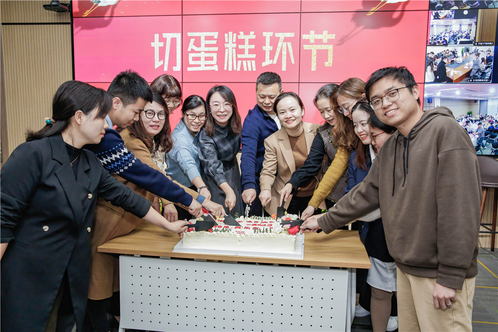 慶典起始,全體人員觀看來自各方的祝福視頻。接著,陳總詳細解讀了本次周年慶主題的深刻含義。在新冠疫情和俄烏戰爭的雙重沖擊下,國際局勢動蕩不安,外貿行業舉步維艱。但陳總表示,只要我們保持初心,重拾信心,前方一定是無限曙光。同時,陳總提出了走出當前困境的五大策略:一是重“質”非“量”的提高,讓工作流程規范化、信息化,以提高操作效率和員工綜合實力;二是在堅持“跟著國家方向走”的總方針下,開拓更多優勝特色市場;三是重視供應鏈的建設和管理;四是鼓勵多業態模式和多元創新;五是建立經濟內循環。發言完畢,陳總和優勝其他股東共同切下了帶著滿滿祝福和愿望的生日蛋糕。