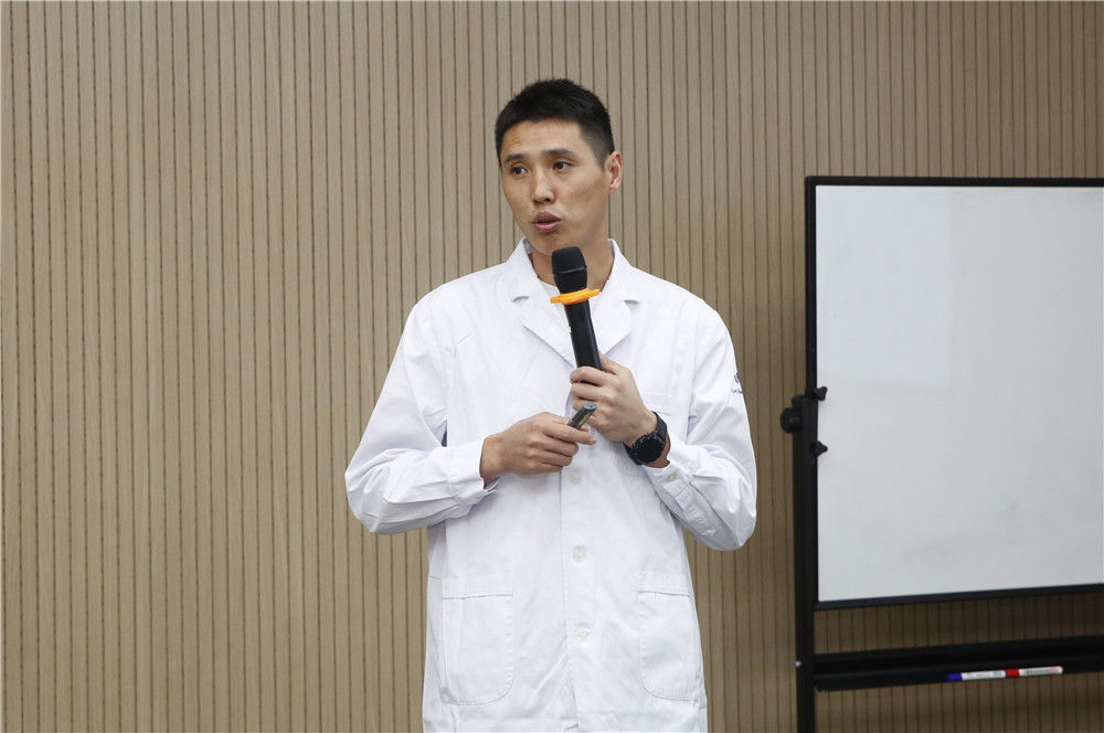 應(yīng)鐵松醫(yī)生從事運(yùn)動醫(yī)學(xué)康復(fù)、中醫(yī)針推理療工作近20年,經(jīng)驗(yàn)十分豐富。應(yīng)醫(yī)生首先針對頸椎、肩關(guān)節(jié)、腰椎、腿部分塊進(jìn)行了詳細(xì)的理論知識講解,并邀請有各部位不適的同事分別上臺現(xiàn)場面診,剖析病痛形成的具體原因,并針對不同癥狀逐一進(jìn)行了對癥的治療動作示范。最后,針對辦公室久坐人員常發(fā)生的頸肩不適,應(yīng)鐵松醫(yī)生現(xiàn)場帶領(lǐng)大家一同做了“搖頭晃腦”頸椎操和“向后仰頭、向后展開肩膀”的放松動作,現(xiàn)場互動氛圍良好。