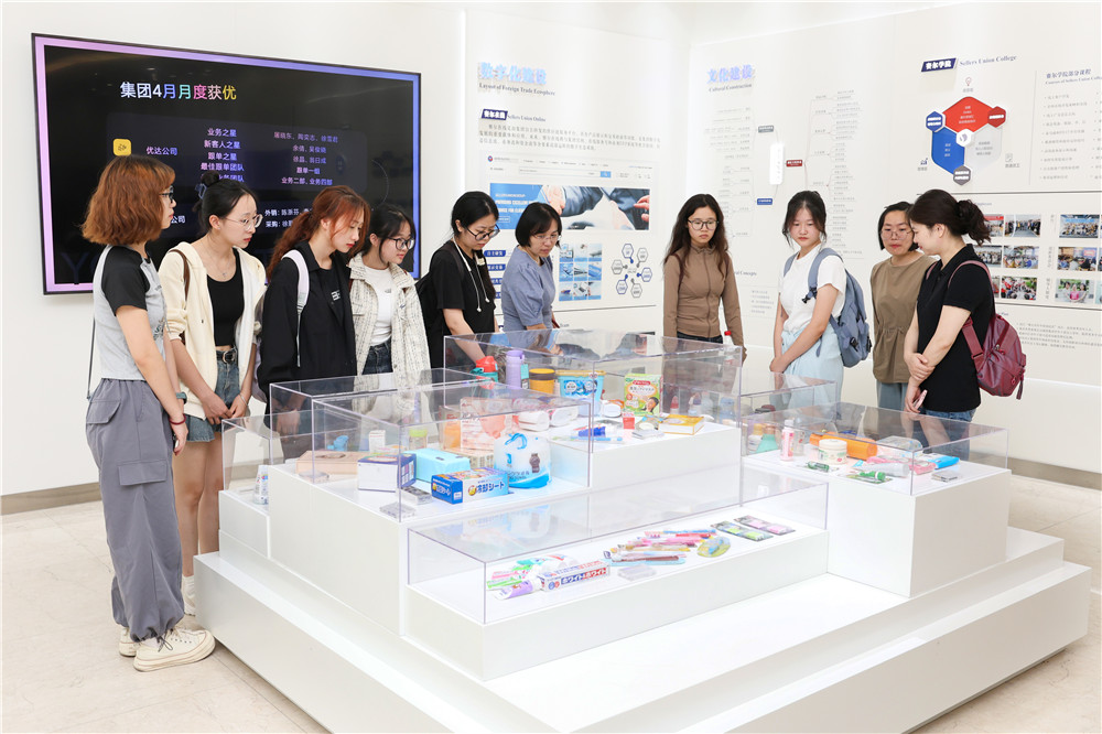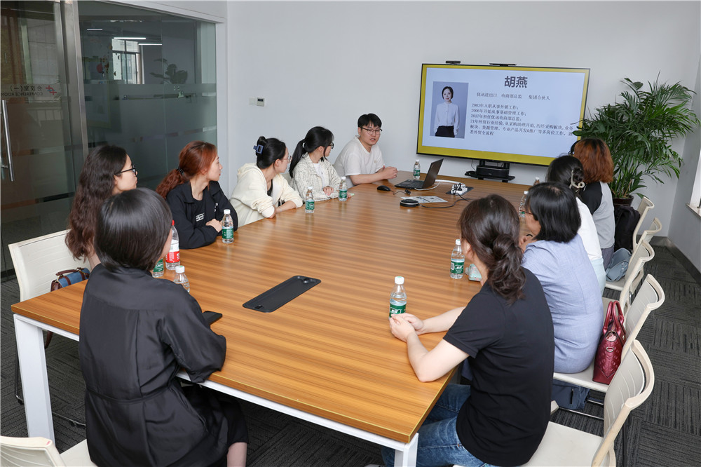 近期,集團多所合作高校校企開放日活動如期而至。6月19日和6月21日,南昌工程學(xué)院和浙江財經(jīng)大學(xué)2025屆優(yōu)秀應(yīng)屆生同學(xué)和老師參訪義烏運營中心。走進一樓大廳,同學(xué)們就被公司的文化展廳吸引,人資部招聘組HR小伙伴為大家一一介紹了集團發(fā)展歷程、經(jīng)營機制、人才培養(yǎng)體系、公司文化及各類興趣社團、公益活動等。文化墻上,集團的全球市場圖和與各國客人的交談合影照片令人眼前一亮,老師和同學(xué)們紛紛詢問了解外貿(mào)拓客的方式、對語言能力的要求等,對外貿(mào)表現(xiàn)出了極大興趣。
