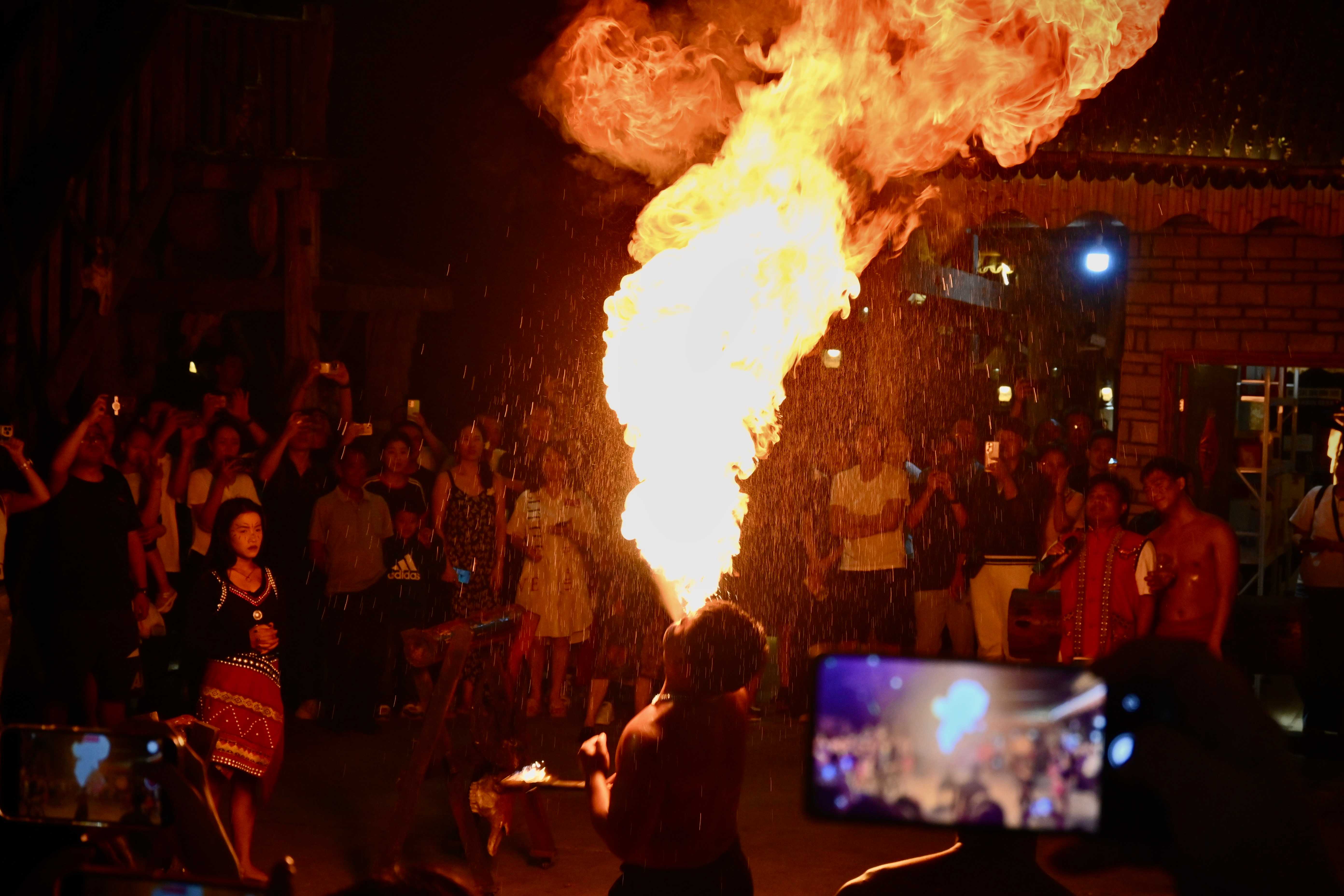 這里有國(guó)內(nèi)最大的星光夜市,凌晨的燈光讓玲瑯滿目的小吃格外誘人。一份春涼粉酸出冷顫,一杯泡魯達(dá)甜上心頭,一碗苦撒直擊靈魂,一口包燒熱辣滾燙。我們?cè)谟炅滞讲剑谪敉跽瘒艋鹛瑁惺苌贁?shù)民族的歡樂與自在。