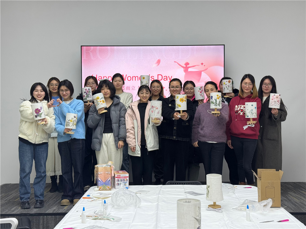 一場治愈系手作盛宴暖心開場,從挑選干花、構思圖案到精準塑封,姐妹們指尖流轉巧思,將山茶、雛菊、櫻花等春日信物融入燈罩。壓花時的專注、拼貼時的笑語、點亮臺燈時的驚嘆……光影交錯間,一件件專屬藝術臺燈誕生!每一盞燈都是職場之外的溫柔自白,更是獻給自己的“高光作品”。活動尾聲,大家抱著親手制作的壓花臺燈合影,暖黃燈光映亮笑顏,辦公室瞬間變身“春日藝術館”!